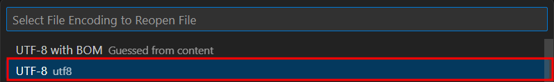 뜨는 창에서 'Reopen width Encoding' 을 클릭, UTF-8 을 선택해주면 된다.